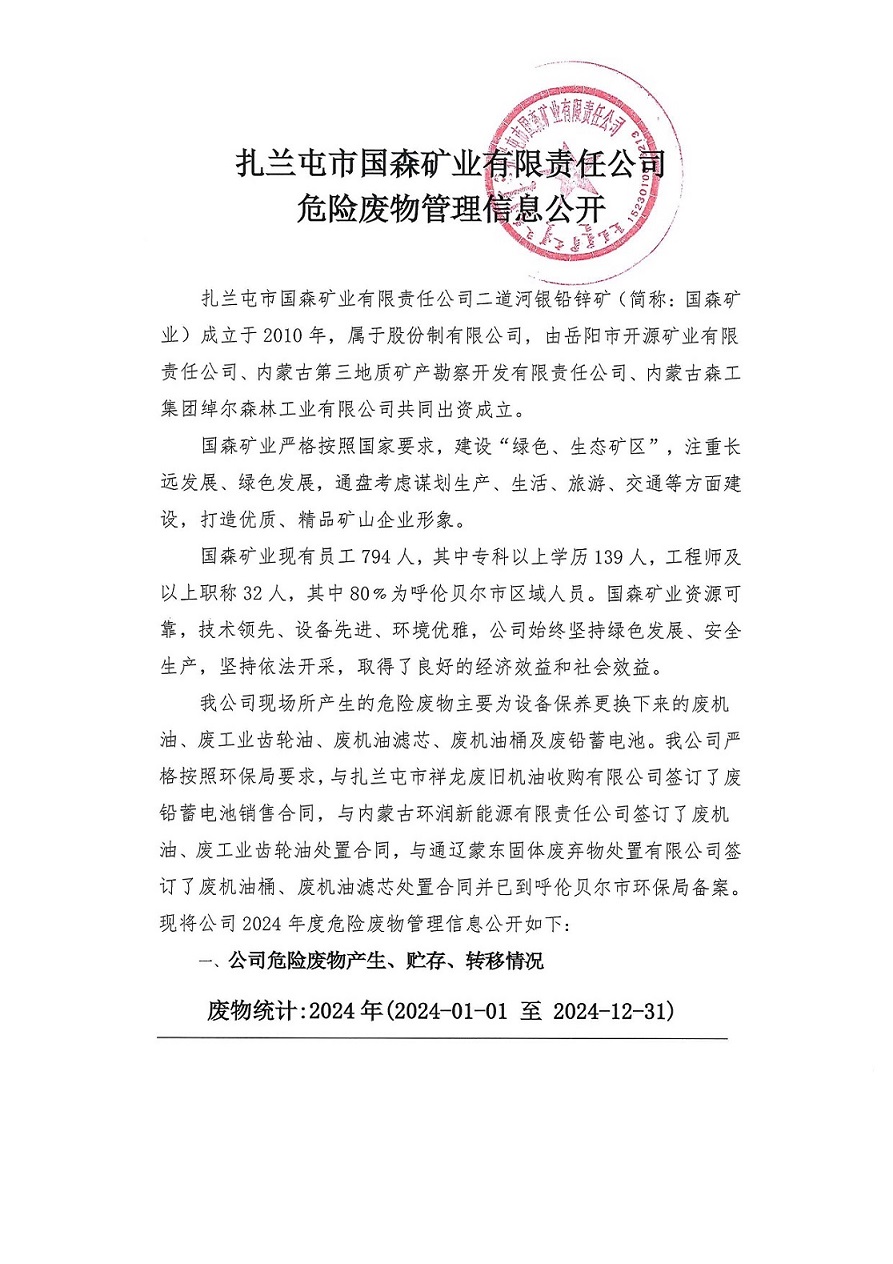 扎蘭屯市國森礦業(yè)有限責(zé)任公司危險廢物管理信息公開